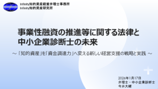 2026/1/17に弊所所長の今井弁理士が『事業性融資の推進等に関する法律と中小企業診断士の未来 ~「知的資産」を「資金調達力」へ変える新しい経営支援の戦略と実践 ~』と題して、神奈川県中小企業診断協会 登録グループ 「強み経営研究会」にて...